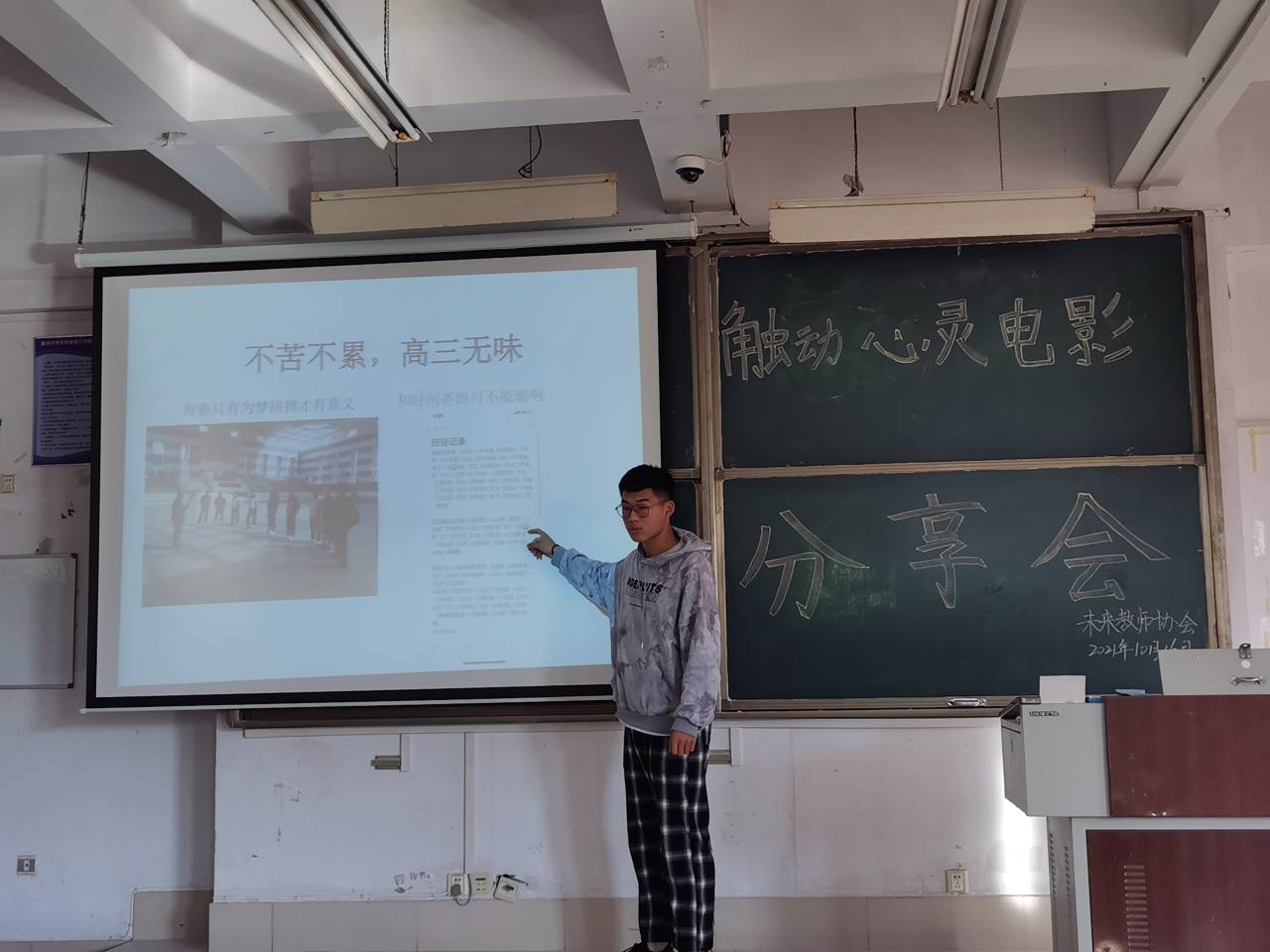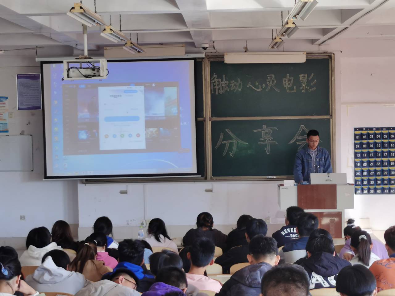 活动开始,主持人介绍活动目的,然后同学们依次上台分享喜欢的电影,精心制作的幻灯片配上同学们流利的口才吸引了在场的每一位听众,从反对歧视黑人的《绿皮书》到抗击疫情的《中国医生》,《悬崖之上》、《我不是药神》、《当幸福来敲门》每一部电影都让人回味无穷。同学们完成全部的分享后,主持人总结活动经过,触动心灵电影分享会圆满结束。