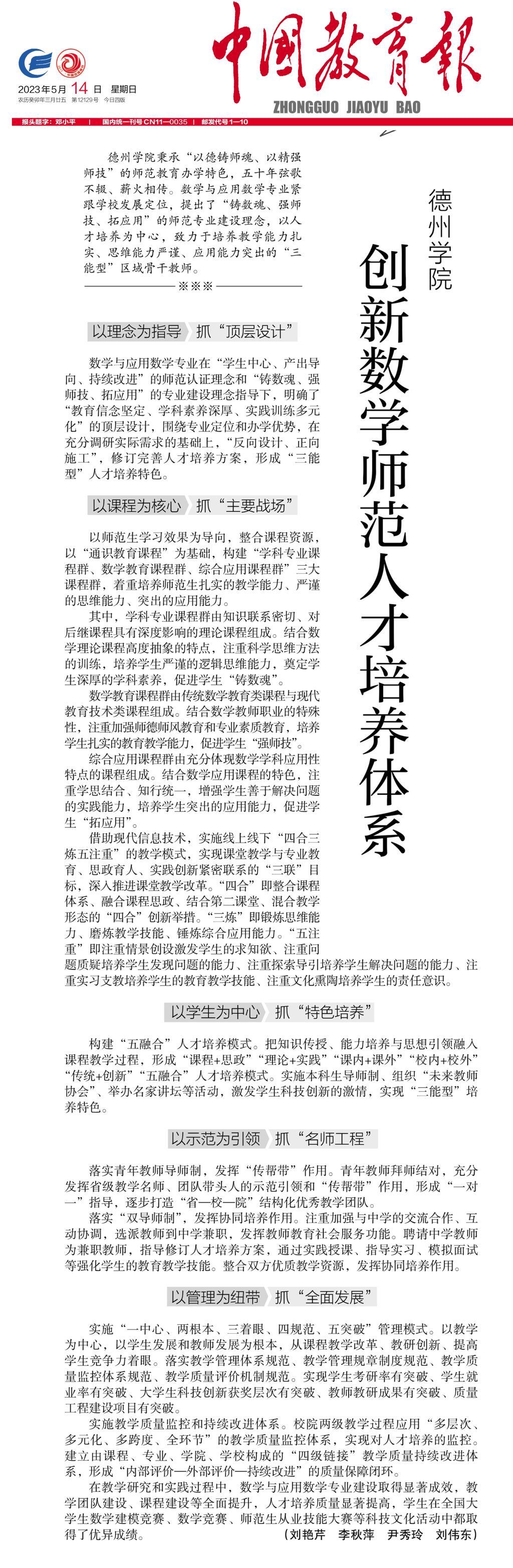 在教学研究和实践过程中,数学与应用数学专业建设取得显著成效,教学团队建设、课程建设等全面提升,人才培养质量显著提高,员工在全国老员工数学建模竞赛、数学竞赛、师范生从业技能大赛等科技文化活动中都取得了优异成绩。(刘艳芹 李秋萍 尹秀玲 刘伟东)