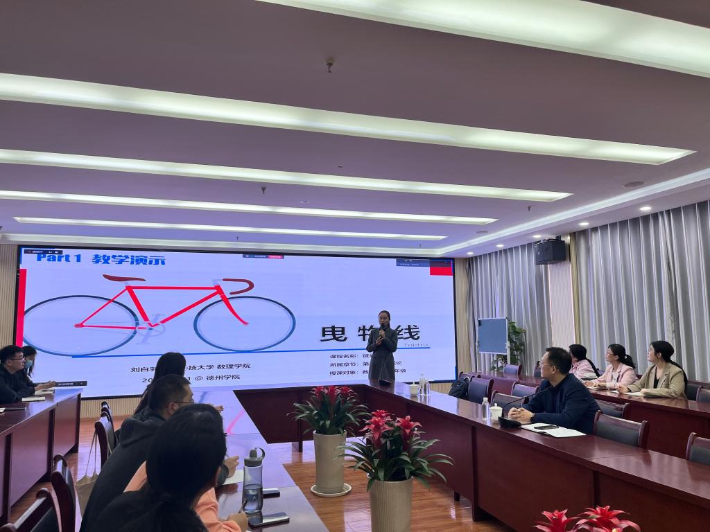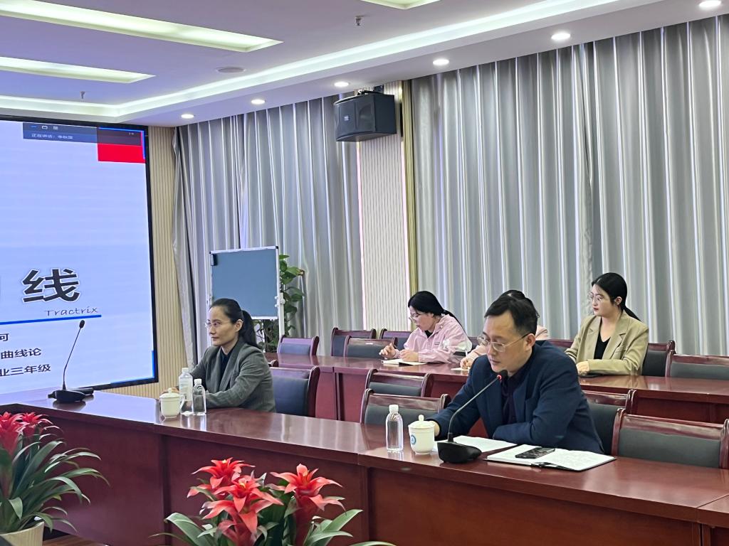 刘教授现场进行20分钟的教学演示,内容为微分几何课程中的《曳物线》一节,她从自行车车轮的运行轨迹进行引入,介绍了曳物线的定义、曳物线的方程、直线的曳物线、一般曲线的曳物线,引入自然,讲解生动,深入浅出,动画与内容完美结合,例子紧密联系实际。随后,刘教授细致的讲解《等周不等式》的教学设计。最后,参会教师与刘教授就青教赛的教学内容和过程设计过程展开热烈交流。