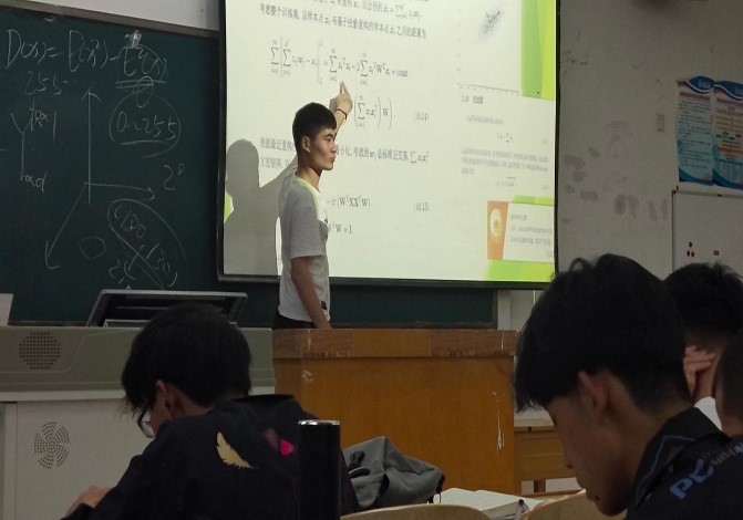 在报告中,沈老师首先介绍了我国大数据与人工智能发展历程和现状,然后讲解了目前常用的大数据分析流程及数学与统计学方法所处的核心位置,最后要求大家坚持“数学不断线”和“编程不断线”的学习策略,并通过组建兴趣小组等形式开展以数据分析为核心的小项目研究。闫润青同学从切身体会出发,介绍了从传统‘描述统计’到‘统计推理’的发展趋势,尤其‘多元回归统计分析’在生活应用中对海量数据的处理,以高等代数中线性空间、特征值为例讲解了具体‘图片压缩’、推荐算法应用案例,并以MATLAB课程中函数拟合初始值的任意取值为例讲解了梯度下降算法。只要有想法有恒心,一年的时间足以学到很多知识。