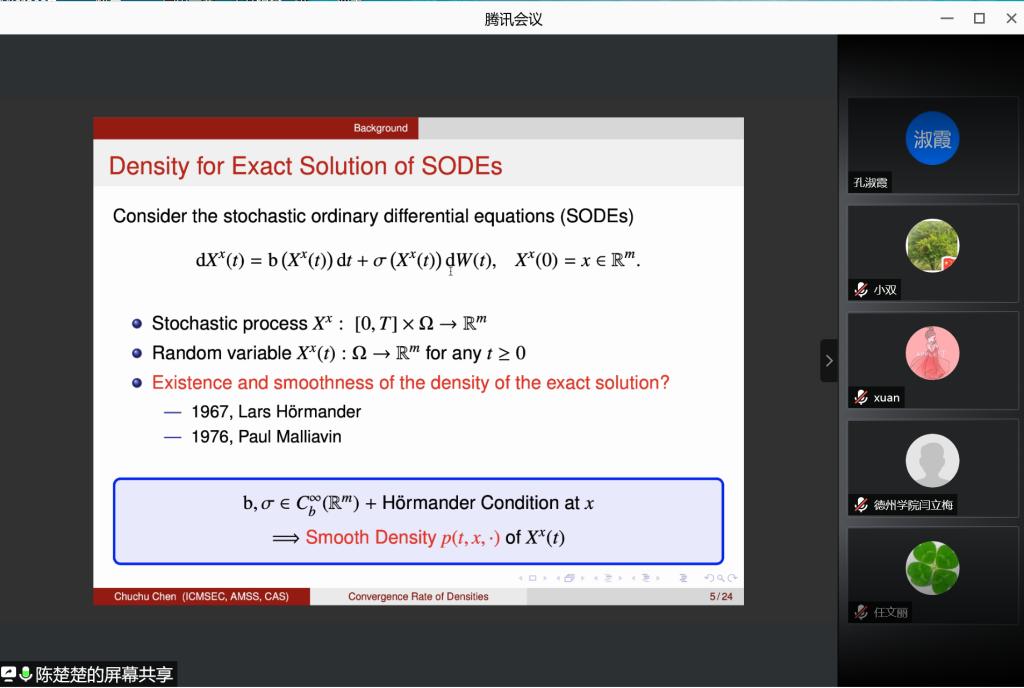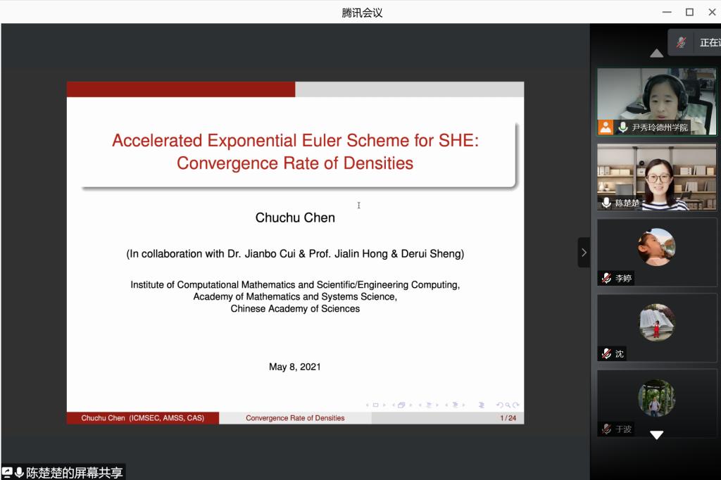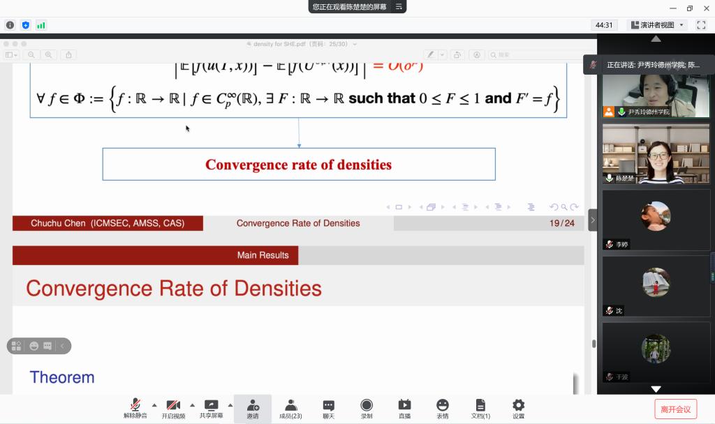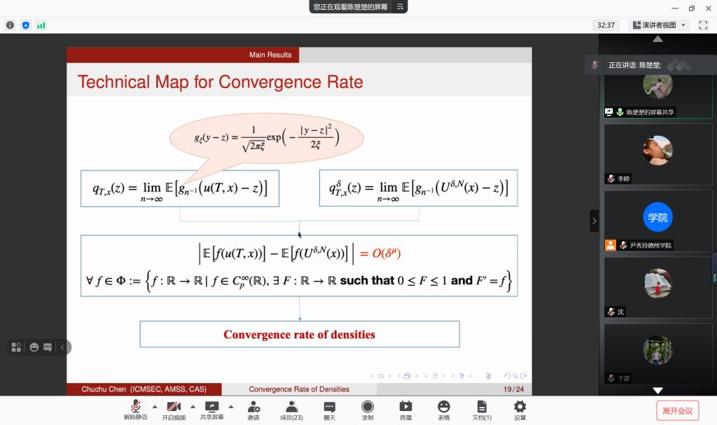 本次讲坛由中国科学院数学与系统科学研究院陈楚楚副研究员做了题为“随机热方程的加速指数欧拉格式:数值解密度的收敛率”的精彩学术报告。在报告中,陈楚楚博士首先介绍随机ODE解的密度的背景和数值逼近理论,随机PDE精确解密度的存在性和光滑性进展,然后给出求解随机热方程的加速指数欧拉格式,利用Malliavin分析手段证明数值解密度的存在性和光滑性,基于数值解的先验估计,提出一种不依赖于测试函数的弱收敛性分析,导出密度在一致收敛意义下的收敛率。最后指出了本领域的进一步的研究工作。