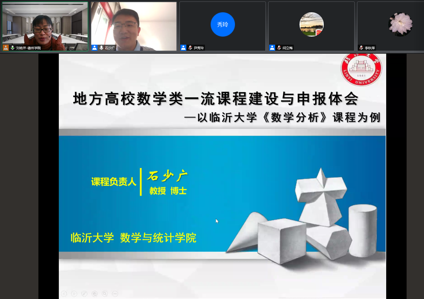 石教授针对地方高校学情特点和一流课程建设要求,以数学类专业学科基础课程《数学分析》为例,从基本情况、申报要求和申报体会三方面和大家交流了地方高校数学类一流课程申报和建设的体会。石教授结合切身教学经历和课程申报经验,作精彩报告近三个小时,分享内容详实丰富,老师们受益匪浅。