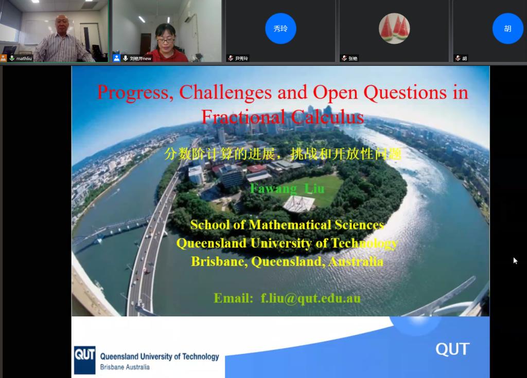 讲座中,刘教授介绍了近几年来澳大利亚昆士兰科技大学分数阶微分方程数值方法团队在从事分数阶计算及其应用的科学研究项目的经验和体会。涉及到的科学研究项目主要包括:海水浸入地下水层问题,分布阶的偏微分方程,多项分数阶偏微分方程,变分数阶微分方程,分数阶模型在医学中的应用(在人类大脑组织的反常扩散),分数阶模型在生物系统的应用(心脏的电生理系统的数值模拟),非牛顿流体新型本构关系模型及分数阶纳米流体的研究和应用,分数阶动力系统的新型计算模型及其在经济学和金融学中的应用,以及前列腺癌的数学模型。刘教授还介绍了分数阶团队在研究分数阶计算的进展,挑战和开放性问题,介绍了分数阶计算在国内外的发展动态。