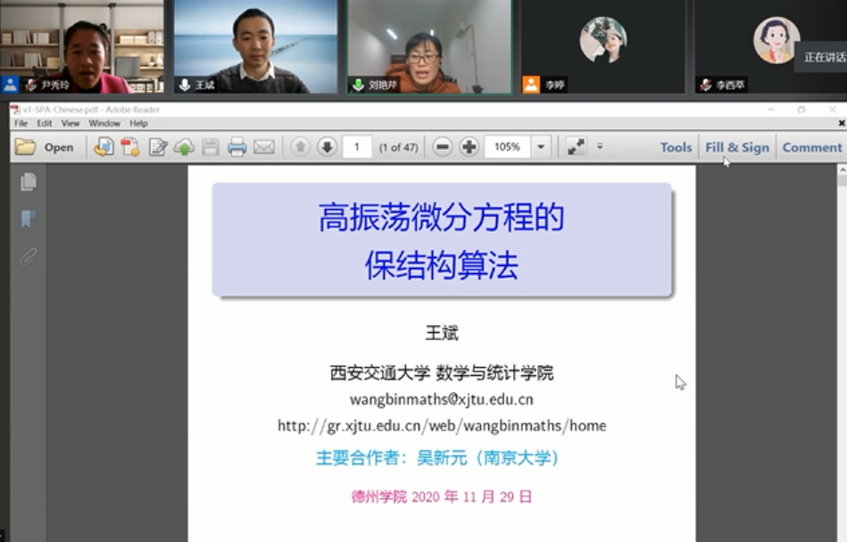 本次讲坛由西安交通大学王斌教授做了题为“高振荡微分方程的保结构算法”的精彩学术报告。王教授首先阐述了高振荡解的特点及保结构算法的发展概况,随后分享了微分方程和数值算法的长期性态的分析,然后针对保结构算法中的保能量算法进行了深入的讲解,最后做了结果的展示和总结。