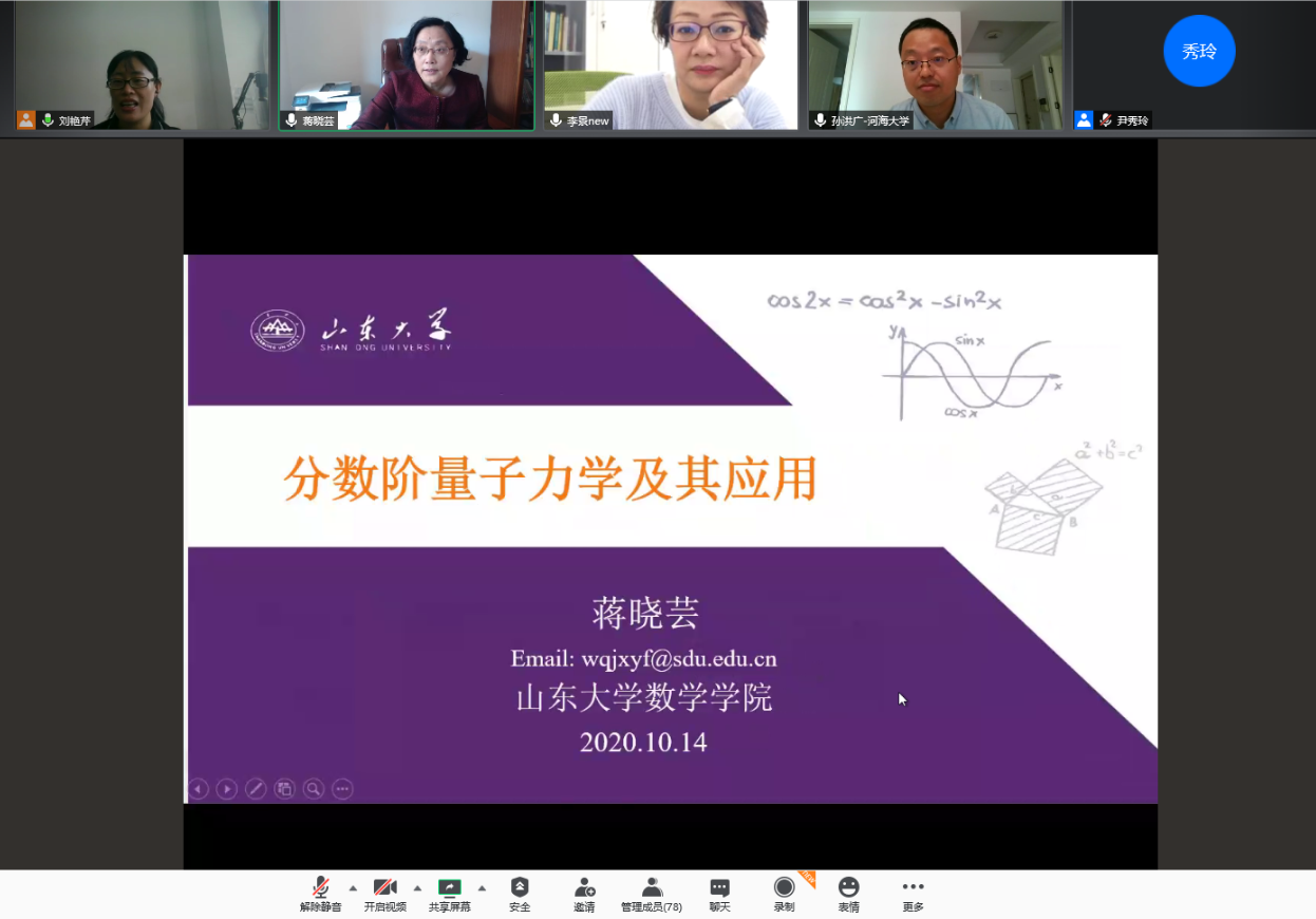 本次讲坛设两场报告,山东大学蒋晓芸教授挂帅做了题为“分数阶量子力学及其应用”的精彩学术报告。蒋教授首先阐述了分数阶量子力学的研究背景,接下来分享了非线性空间分数阶薛定谔方程的傅里叶谱方法及其参数估计,然后深入地讲解了非线性时空分数阶薛定谔方程的齐性和快速计算研究,最后做了总结和展望。