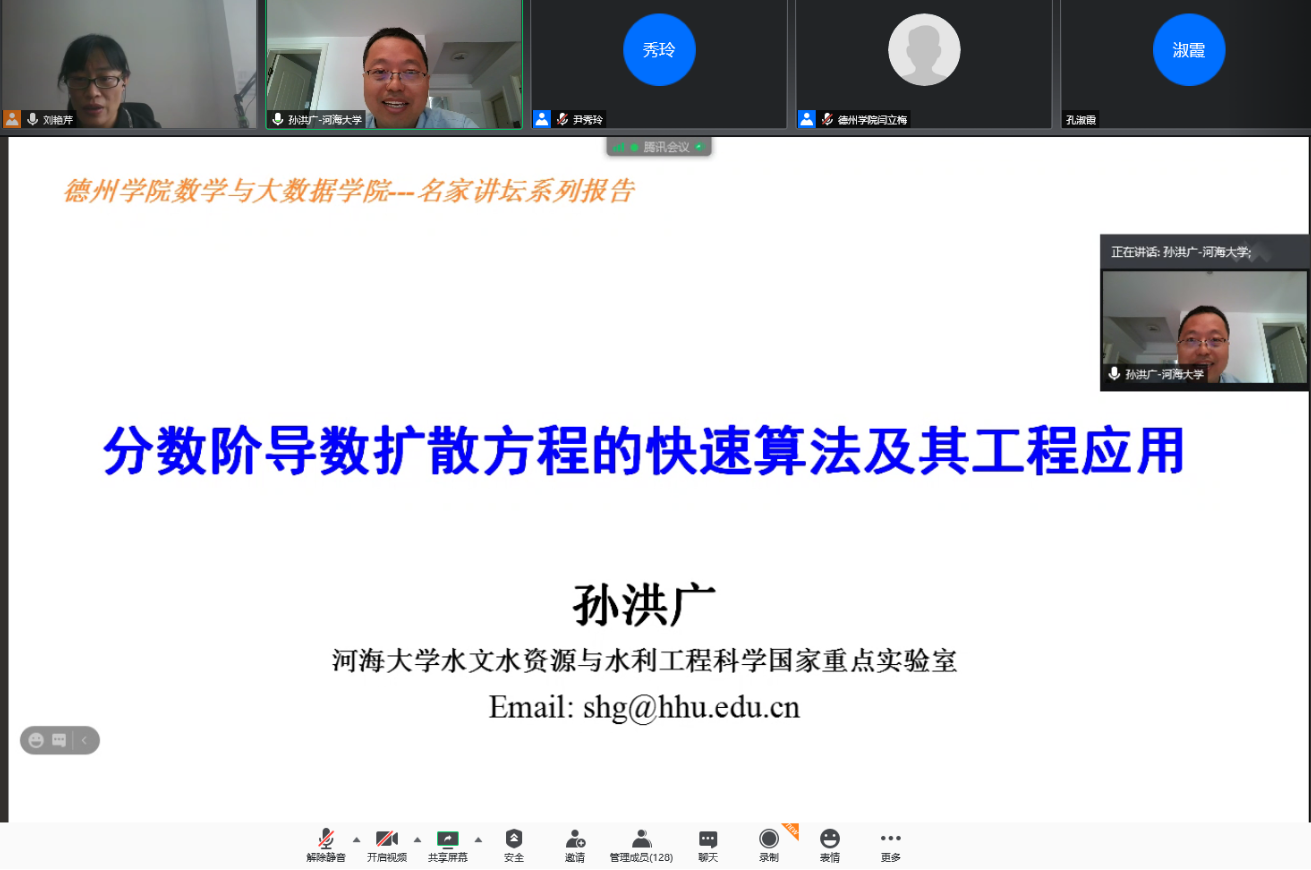河海大学孙洪广教授做了题为“分数阶导数扩散方程的快速算法及其工程应用”的压轴学术报告。孙教授图文并茂地介绍了分数阶导数扩散方程的工程应用背景、时间分数阶扩散方程的半离散有限单元算法和尺度依赖算法、时空分数阶导数扩散模型的半离散Kansa方法、变导数径向分数阶扩散方程的快速Kansa算法。