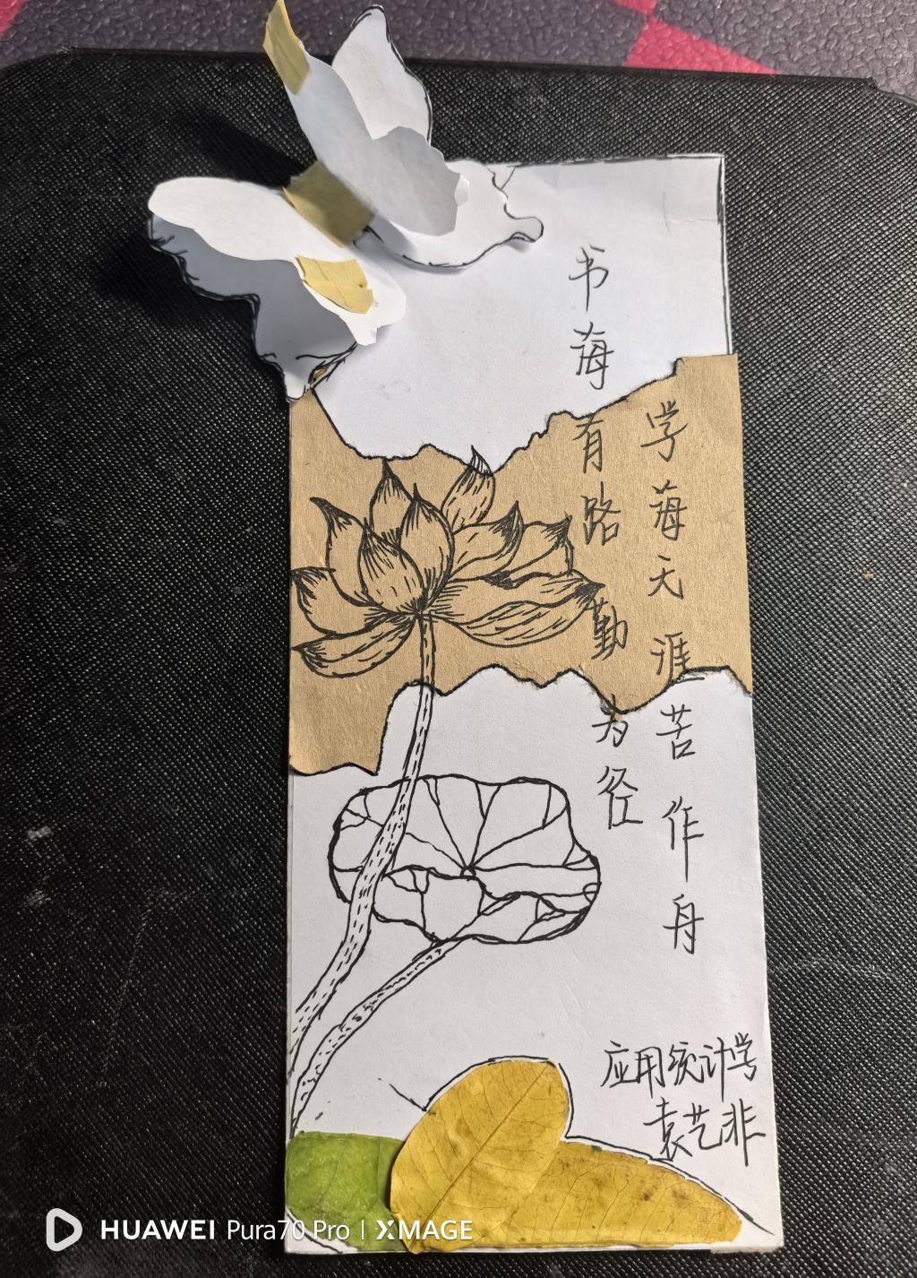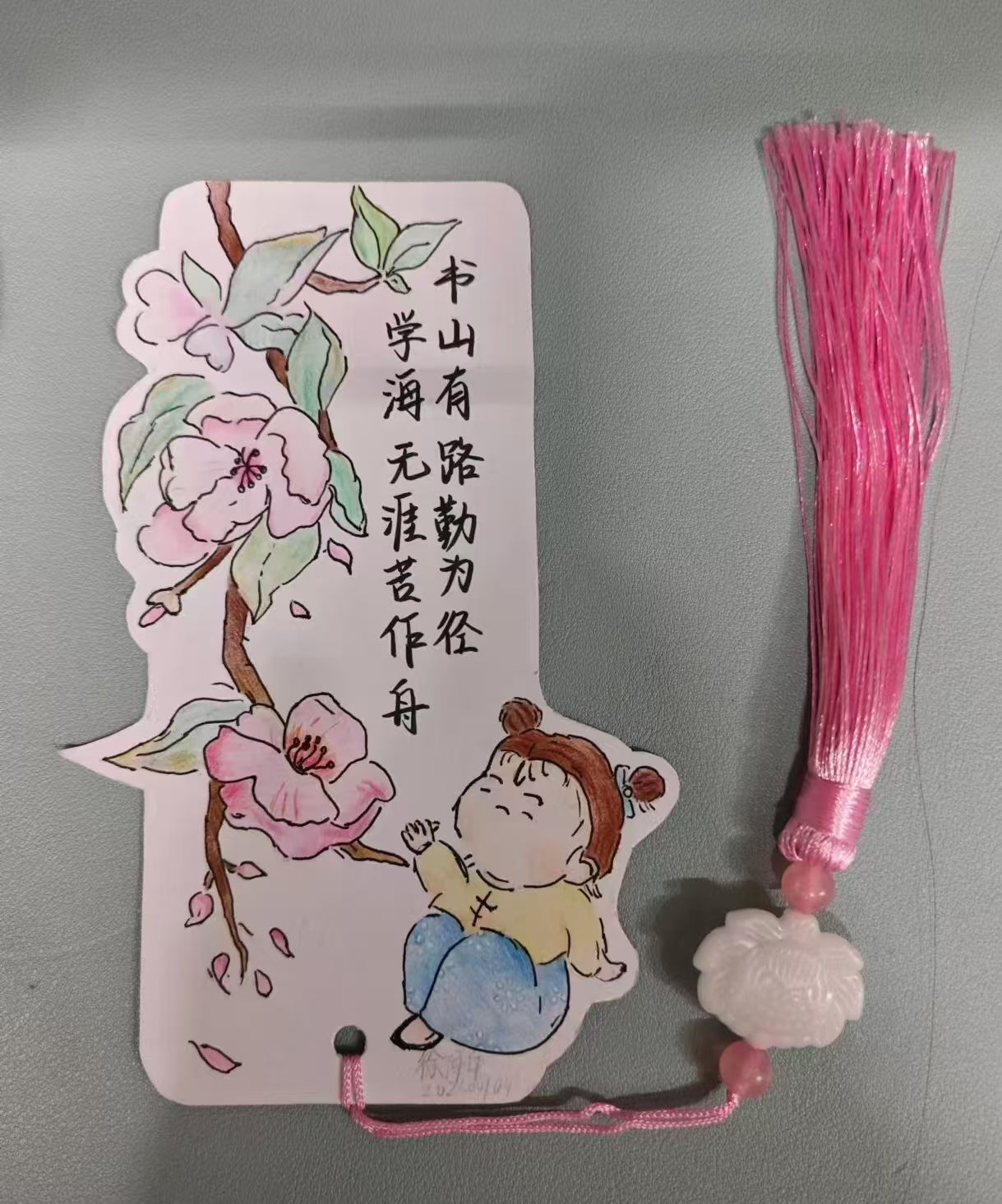 活动伊始,同学们使用各种材料,如彩纸、丝线、树叶等,将丰富的想象力融入书签制作。巧妙的设计、精美的版式、励志的话语等汇集在一张小小的书签中,方寸之间,寄托着对创意的追求,灵感的挥洒,包含着无限的诗情画意,简单却不失内涵,朴素却不乏美感。每一枚书签都是独一无二的艺术品,呈现出意境美的同时,还展现出令人惊喜的立体艺术效果。