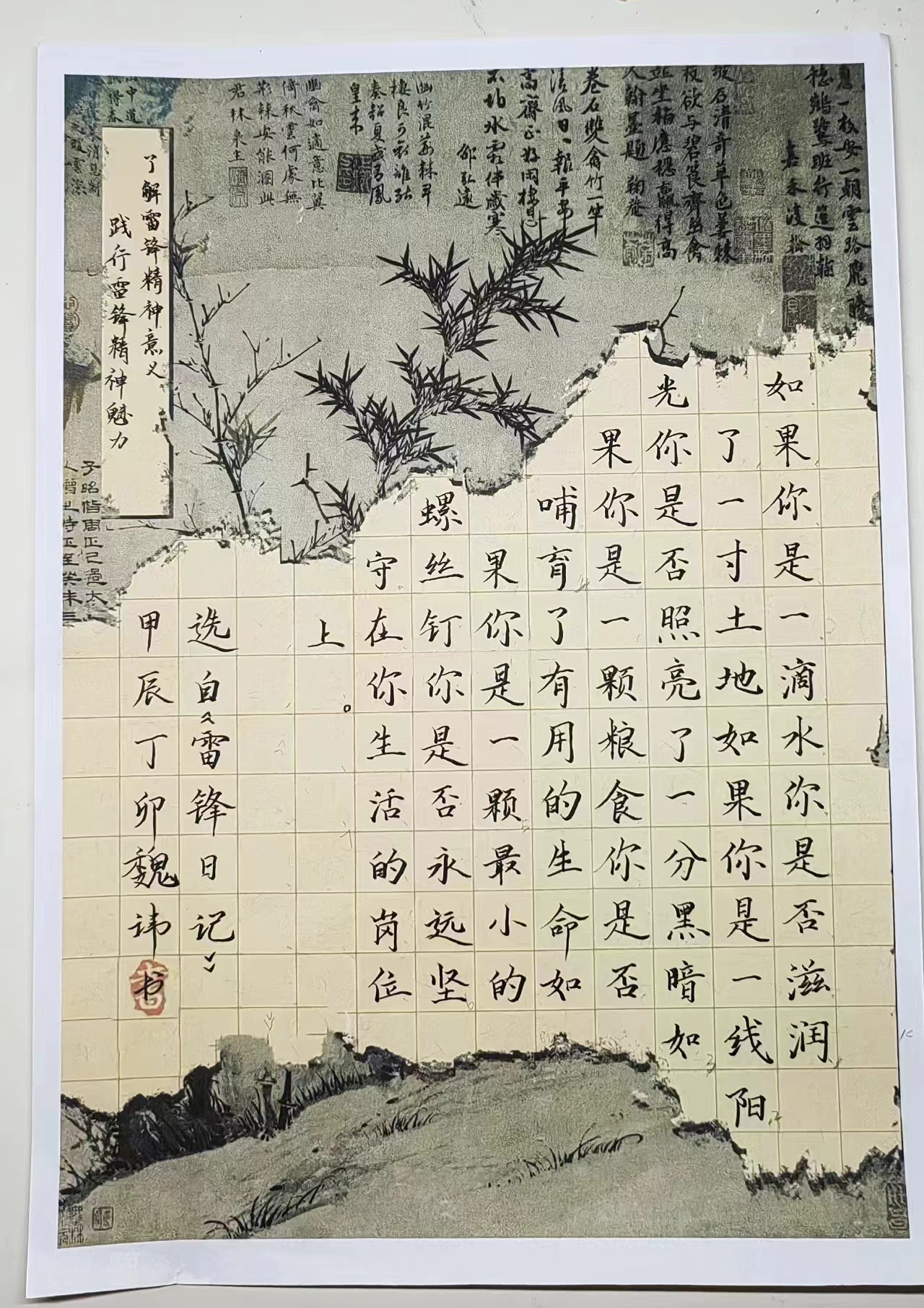 同学们热情参与,积极准备,借助图书资料,历史文献,网络搜索等工具,了解雷锋精神的深刻意义和内涵。书写端正,结构严谨,弘扬雷锋精神,书写时代新风,将雷锋精神贯彻于书法作品中,体现了当代青年的良好精神风貌。最后,同学们将完成的作品图上传到指定邮箱,由活动负责人根据书写内容,卷面整洁度,书写美观度进行评选。