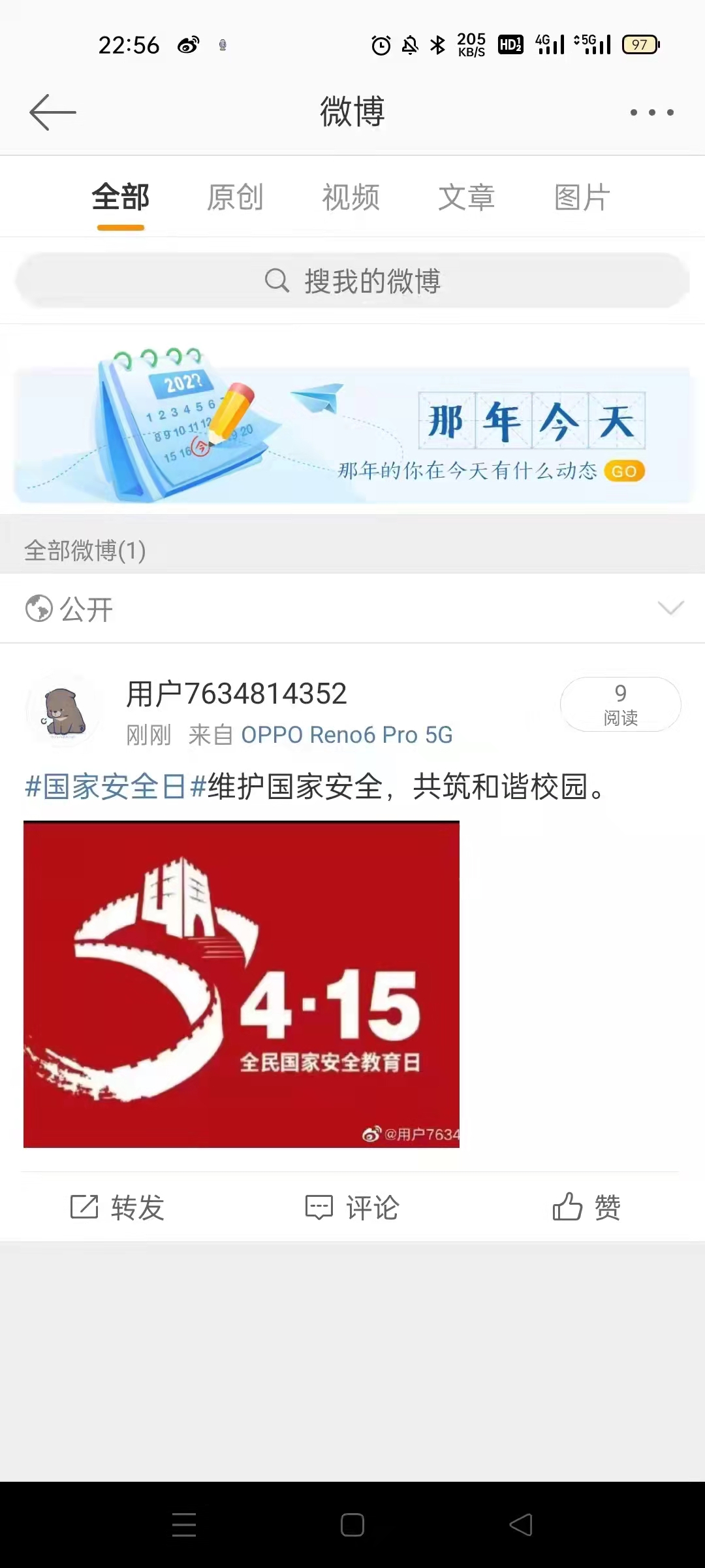 国家安全是指国家政权、主权、统一和领土完整、人民福祉、经济社会可持续发展和国家其他重大利益相对处于没有危险和不受内外威胁的状态,以及保障持续安全状态的能力。2022年4月15日是第七个全民国家安全教育日,主题是“树牢总体国家安全观,感悟新时代国家安全成就,为迎接党的二十大胜利召开营造良好氛围”。本次活动员工通过关注微信视频号“@中国老员工在线”后进入首页“全民国家安全教育”活动专题,添加话题#守护青春 #全民国家安全教育日,并@中国老员工在线 @微信高校 @集团官方及师生好友账号后发布原创主题短视频,参与话题接力。