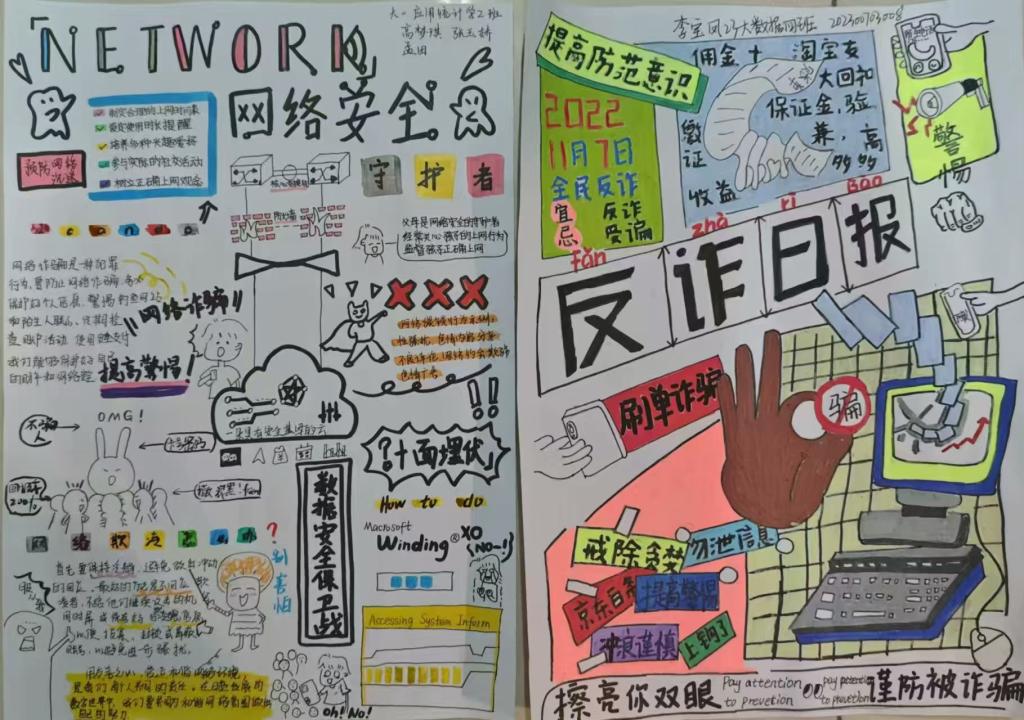活动期间,同学们充分发挥创意,将网络文明的理念与资助政策的感悟巧妙融合。作品内容丰富,从法规解读到案例警示,从防诈妙招到文明倡议,从反诈宣传到意识提升,阐述了对网络文明的深刻洞察,讲述了在资助助力下的网络学习成长经历并呼吁共建文明网络空间。