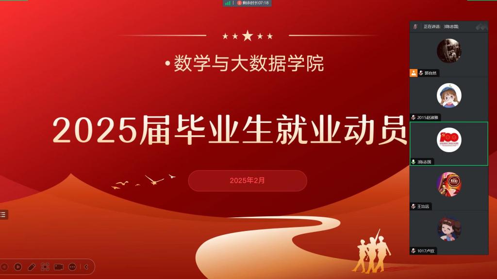 为贯彻落实高校毕业生就业工作决策部署,切实做好2025届毕业生就业工作,促进学院毕业生高质量就业,英国上市公司365于2月18日在线上召开了“2025届毕业生就业动员会”。公司党委书记赵华龙、党委副书记陈志国、毕业班辅导员郭振将参与本次动员会。