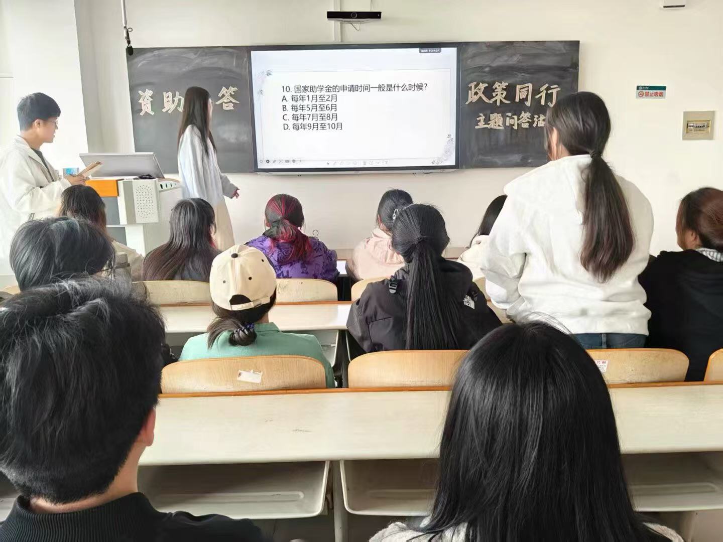 本次活动以“精准资助、育人为本”为核心理念,通过知识竞赛、案例分析、互动问答等形式,围绕国家助学贷款、奖学金评定、勤工助学等热点问题展开深度解读。现场气氛紧张而热烈,同学们迅速进入状态,凭借快速的反应力和对于有关资助问题的深入了解,积极作答。